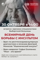 Уважаемые жители Выборга и Выборгского района!Приглашаем вас на тематическую встречу, посвященную Всемирному дню борьбы с инсультом.Наши специалисты простым и понятным языком расскажут о самых важных вещах: как распознать угрозу по самым первым признакам и какие шаги можно предпринять уже сегодня, чтобы значительно снизить риски.Ждем всех 30 октября в 14:00 в лекционном зале Библиотеки Алвара Аалто.