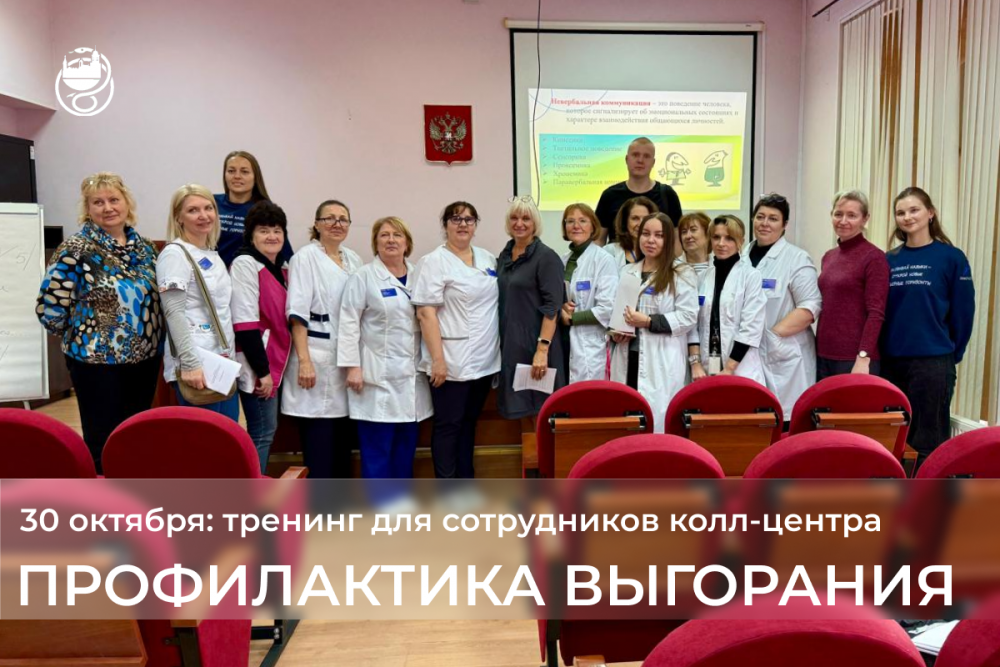 30 октября в конференц-зале городской поликлиники прошел тренинг для сотрудников контакт-центра и медицинских регистраторов, посвященный профилактике синдрома эмоционального выгорания. Мероприятие собрало 20 операторов, которые ежедневно находятся на передовой общения с пациентами.
