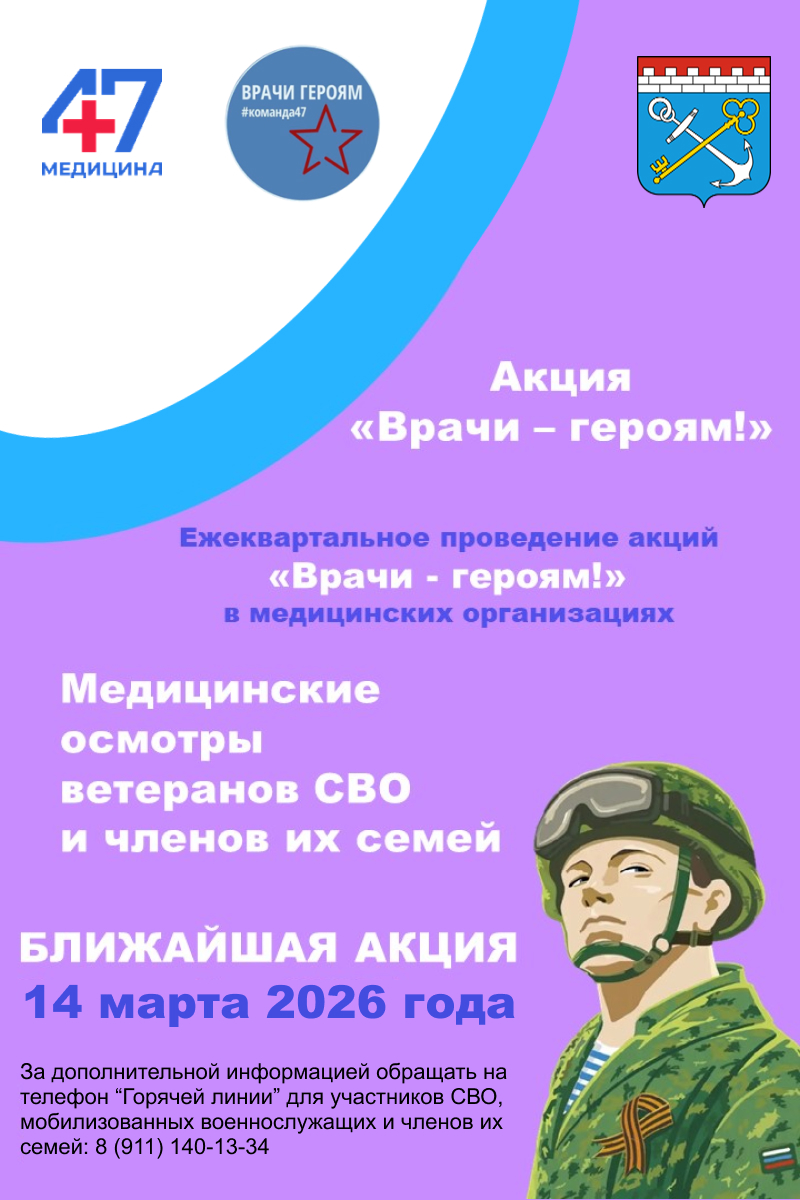 Ежеквартально в медицинских учреждения Ленинградской области проводятся акции «Врачи – Героям» для участников СВО и членов их семей.